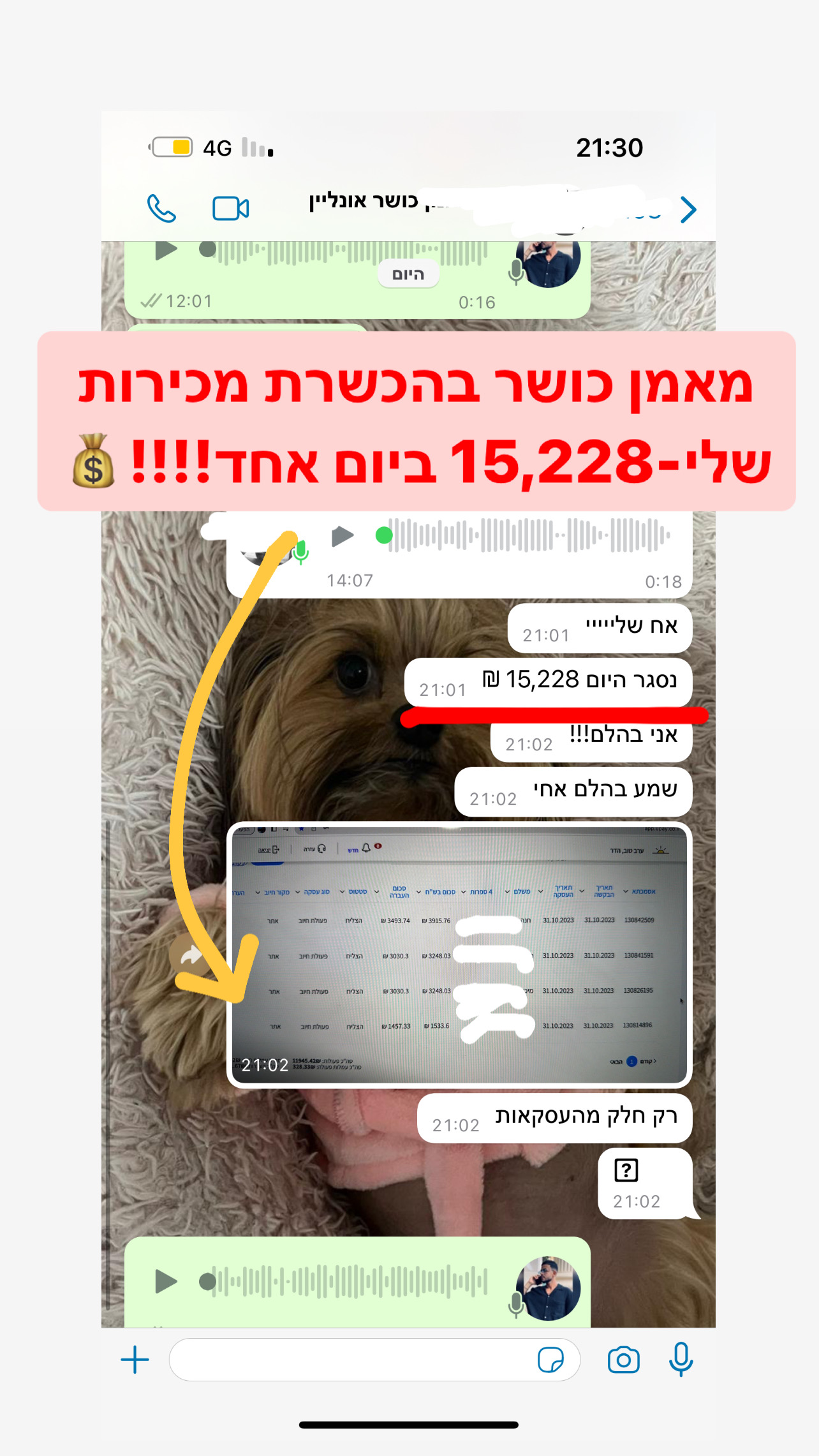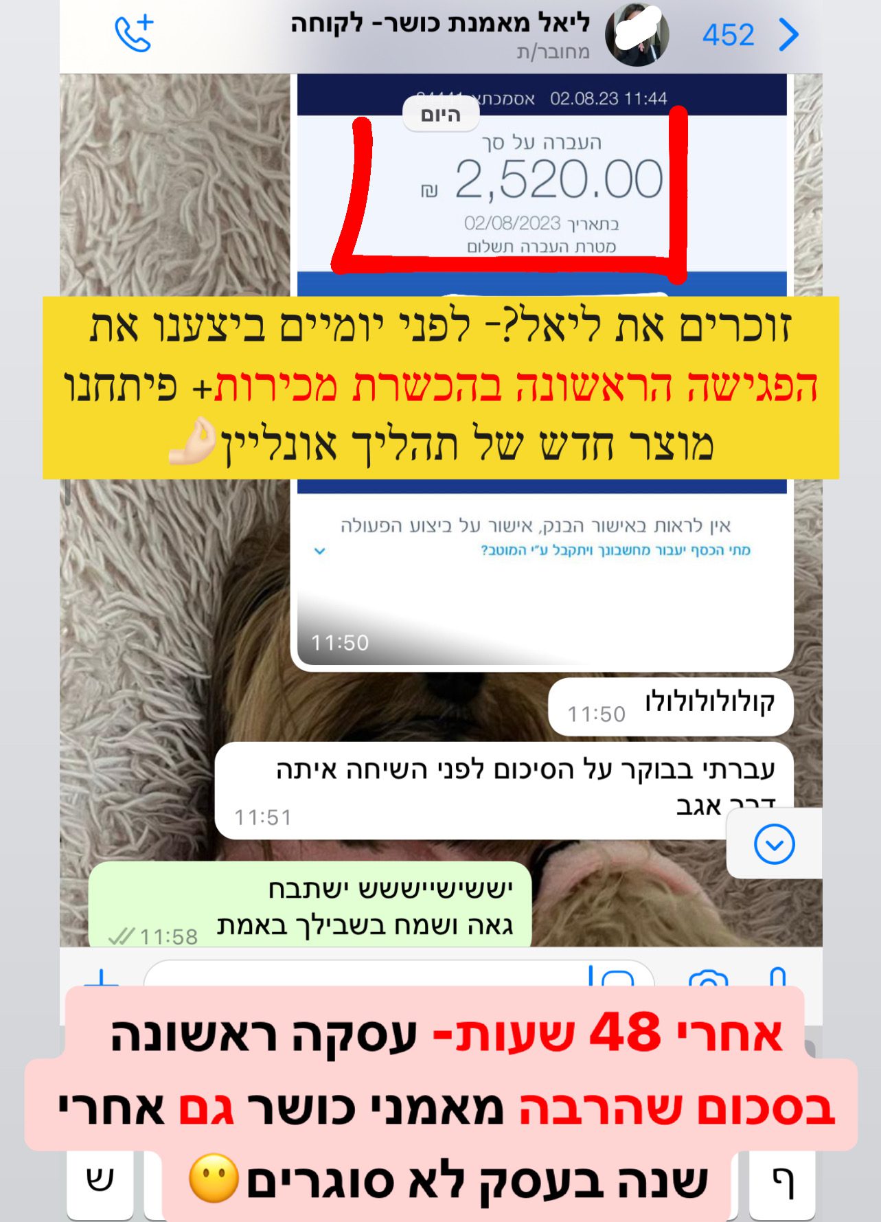 זה לא הולך להיות עוד הכשרה מהירה שתוך יומיים אתה שוכח הכל, אני כאן איתך באופן יומי לשאלות בזמן אמת (מה שבוודאות יעזור לך לסגור יותר עסקאות!).